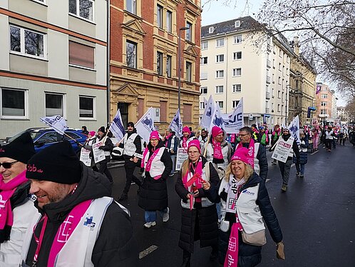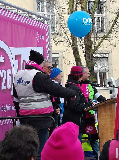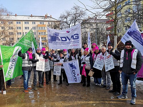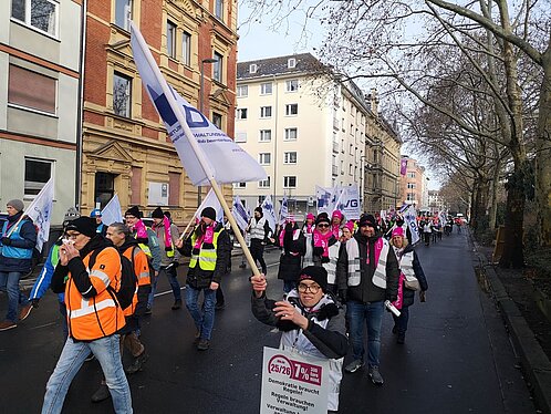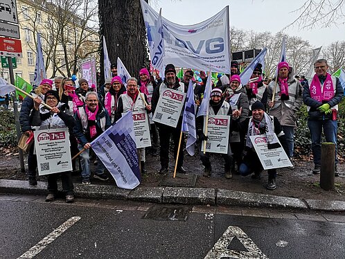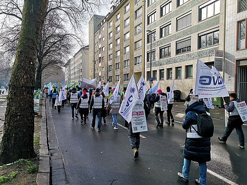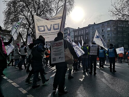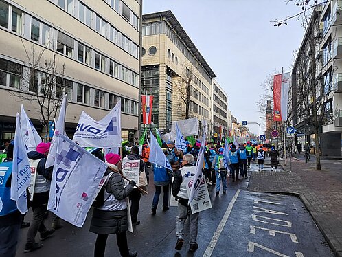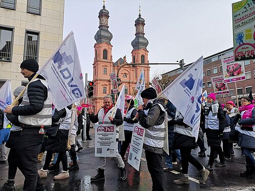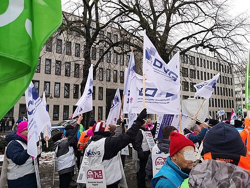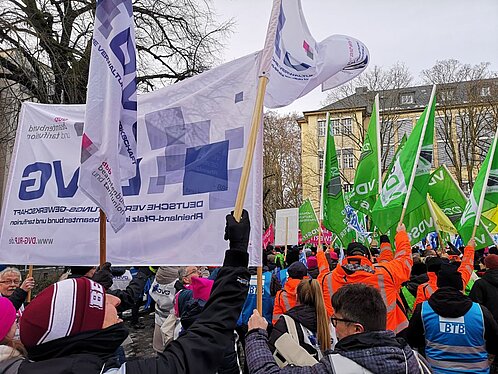 Mit insgesamt 2.500 Teilnehmenden der Mitgliedsgewerkschaften des dbb rlp waren Mitglieder der DVG RLP am vergangenen Mittwoch in Mainz um den Forderungen für die laufende Einkommensrunde der Länder Nachdruck zu verleihen. Mit einem etwa 2 km langen Demonstrationszug durch die Mainzer Innenstadt machten die Teilnehmenden deutlich, dass sie von der Arbeitgeberseite endlich ein verhandelbares Angebot erwarten, um für die nächste und vorerst letzte Verhandlungsrunde ab 11.02. in Potsdam einen Abschluss der Verhandlungen ins Visier nehmen zu können. Die abschließende Kundgebung auf dem Ernst-Ludwig-Platz war auch ein deutliches Zeichen dafür, dass bei Scheitern der Verhandlungen mit weiteren und intensiveren Streiks und Demonstrationen zu rechnen sein wird. Bei möglichen weiteren Aktionen sind dann auch die Mitglieder der DVG RLP gefordert, die bislang Ihre Energie und Kampfbereitschaft geschont haben.